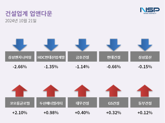 (서울=NSP통신) 정현우 기자 = 21일 코스피(0.43%)와 코스닥(0.89%)은 모두 상승했고 건설주는 전 거래일 대비 0.54% 하락했다. 82종목 가운데 31종목이 상승, 40종목이 하락했고 보합세는 11종목이다. 전 거래일 대비 상승 종목은 16개 늘었다.