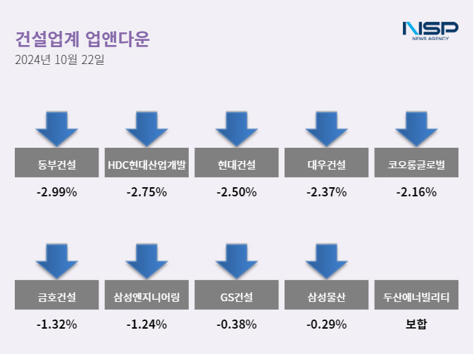 (서울=NSP통신) 정현우 기자 = 22일 코스피(-1.31%)와 코스닥(-2.84%)은 모두 하락했고 건설주는 전 거래일 대비 1.68% 하락했다. 82종목 가운데 10종목이 상승, 60종목이 하락했고 보합세는 12종목이다. 전 거래일 대비 상승 종목은 21개 줄었다.