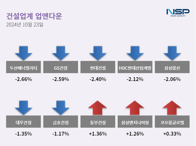 (서울=NSP통신) 정현우 기자 = 23일 코스피(1.12%)와 코스닥(0.93%)은 모두 상승했고 건설주는 전 거래일 대비 0.49% 하락했다. 82종목 가운데 34종목이 상승, 39종목이 하락했고 보합세는 9종목이다. 전 거래일 대비 상승 종목은 24개 늘었다.