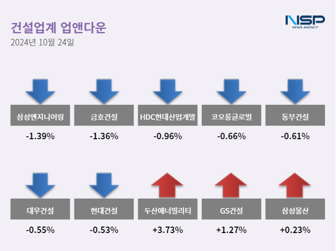 (서울=NSP통신) 정현우 기자 = 24일 코스피(-0.72%)와 코스닥(-1.42%)은 모두 하락했고 건설주는 전 거래일 대비 0.64% 하락했다. 82종목 가운데 17종목이 상승, 58종목이 하락했고 보합세는 7종목이다. 전 거래일 대비 상승 종목은 17개 줄었다.