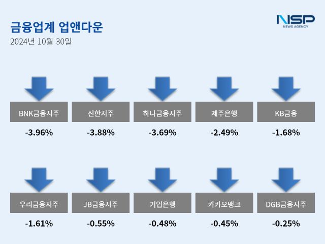 (서울=NSP통신) 강수인 기자 = 30일 코스피(-0.92%)와 코스닥(-0.80%)은 모두 하락했다. 이 가운데 은행주는 전거래일 대비 2.24% 하락했다. 은행주는 11종목 가운데 1종목이 상승, 10종목이 하락했다.