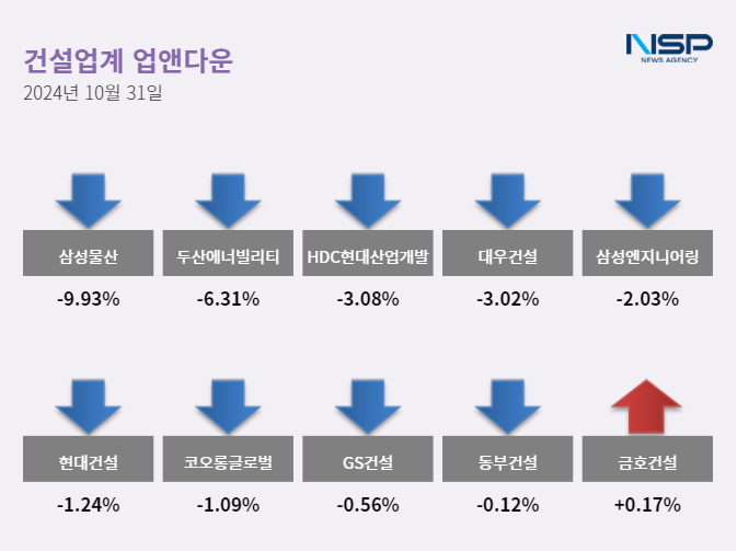 (서울=NSP통신) 정현우 기자 = 31일 코스피(-1.45%)는 하락, 코스닥(0.66%)은 상승했다. 건설주는 전 거래일 대비 -0.91% 하락했다. 82종목 가운데 35종목이 상승, 37종목이 하락했고 보합세는 10종목이다. 전 거래일 대비 상승 종목은 3개 늘었다.