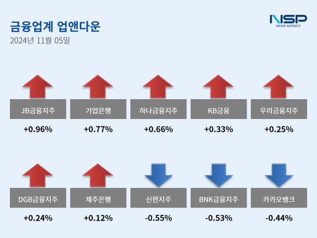 (서울=NSP통신) 강수인 기자 = 5일 코스피(-0.47%)와 코스닥(-0.30%)은 하락했다. 이 가운데 은행주는 전거래일 대비 0.41% 상승했다. 은행주는 11종목 가운데 7종목이 상승, 3종목이 하락했다. 보합세는 1종목이다.