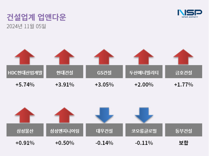 (서울=NSP통신) 정현우 기자 = 5일 코스피(-0.47%)와 코스닥(-0.30%)은 모두 하락했고 건설주는 전 거래일 대비 1.32% 상승했다. 82종목 가운데 43종목이 상승, 28종목이 하락했고 보합세는 11종목이다.