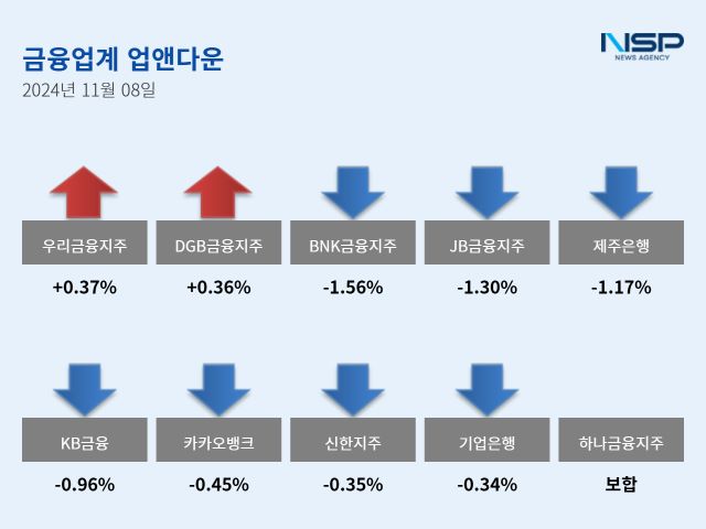 (서울=NSP통신) 강수인 기자 = 8일 코스피(-0.14%)와 코스닥(+1.34%)은 상승과 하락이 엇갈렸다. 이 가운데 은행주는 전거래일 대비 0.46% 하락했다. 은행주는 11종목 가운데 3종목이 상승, 7종목이 하락했다. 보합세는 1종목이다.
