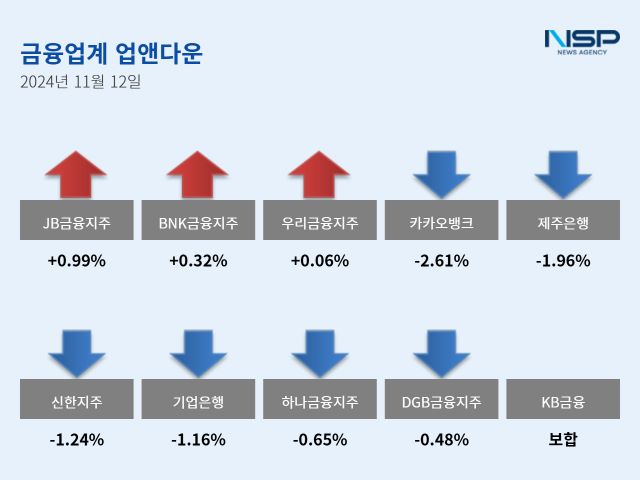 (서울=NSP통신) 강수인 기자 = 12일 코스피(-1.94%)와 코스닥(-2.51%)은 모두 하락했다. 이 가운데 은행주는 전거래일 대비 0.66% 하락했다. 은행주는 11종목 가운데 3종목이 상승, 7종목이 하락했다. 보합세는 1종목이다.