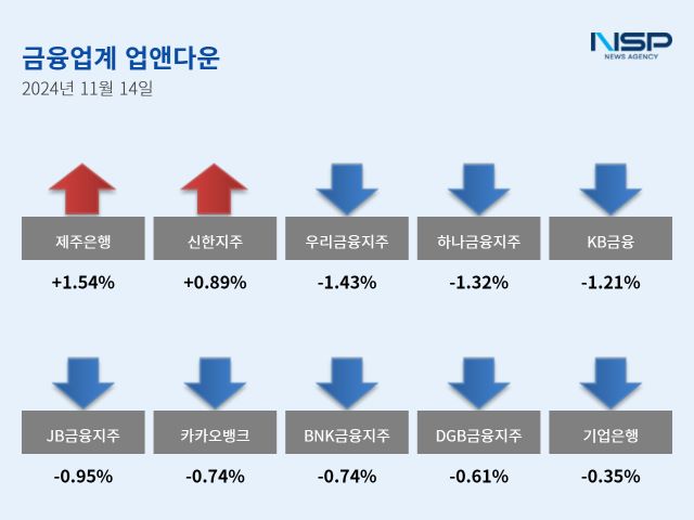 (서울=NSP통신) 강수인 기자 = 14일 코스피(+0.07%)와 코스닥(-1.17%)은 상승과 하락이 엇갈렸다. 이 가운데 은행주는 전거래일 대비 0.61% 하락했다. 은행주는 11종목 가운데 2종목이 상승, 9종목이 하락했다.