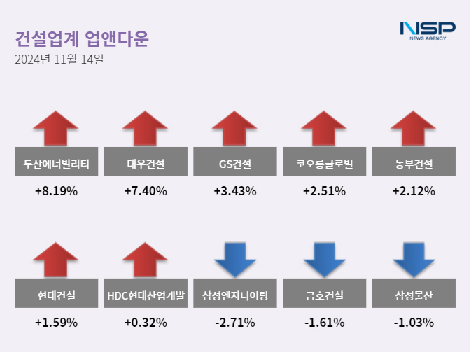 (서울=NSP통신) 정현우 기자 = 14일 코스피(0.07%)는 상승했고 코스닥(-1.17%) 하락했다. 건설주는 전 거래일 대비 0.87% 상승했다. 82종목 가운데 44종목이 상승, 29종목이 하락했다. 보합세는 9종목이다.