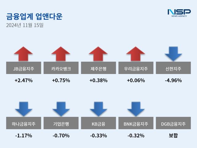 (서울=NSP통신) 강수인 기자 = 15일 코스피(-0.08%)와 코스닥(+0.57%)은 하락과 상승이 엇갈렸다. 이 가운데 은행주는 전거래일 대비 1.32% 하락했다. 은행주는 11종목 가운데 4종목이 상승, 6종목이 하락했다. 보합세는 1종목이다.