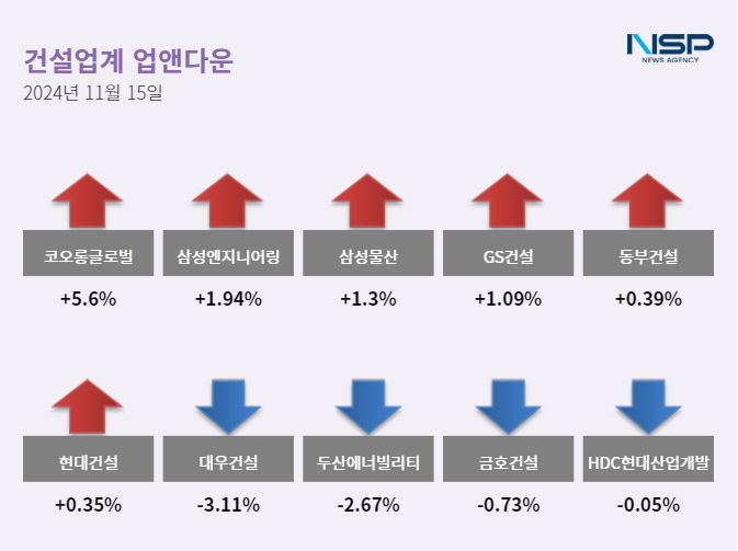 (서울=NSP통신) 정현우 기자 = 15일 코스피(-0.08%)는 하락했고 코스닥(0.57%)은 상승했다. 건설주는 전 거래일 대비 0.33% 하락했다. 82종목 가운데 41종목이 상승, 34종목이 하락했다. 보합세는 7종목이다.