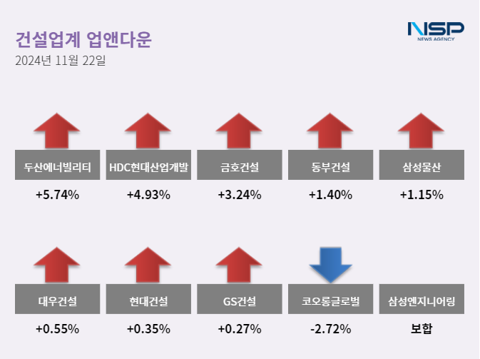 (서울=NSP통신) 정현우 기자 = 22일 코스피(0.83%)는 상승했고 코스닥(-0.54%)은 하락했다. 건설주는 전 거래일 대비 0.58% 상승했고 82종목 가운데 34종목이 상승, 38종목이 하락했다. 보합세는 10종목이다.