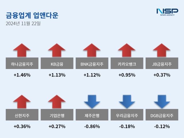 KB금융은 전거래일 대비 1.13%(1100원) 올라 9만8400원으로 장을 마감했고 BNK금융지주는 전거래일 대비 1.12%(110원) 상승해 9960원으로 장을 마쳤다.