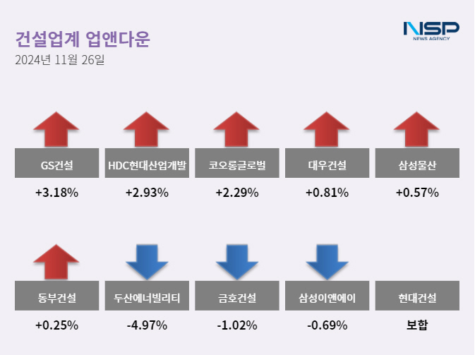 (서울=NSP통신) 정현우 기자 = 26일 코스피(-0.55%)와 코스닥(-0.53%)은 모두 하락했다. 건설주는 전 거래일 대비 0.70% 상승했고 82종목 가운데 42종목이 상승, 30종목이 하락했다. 보합세는 10종목이다.