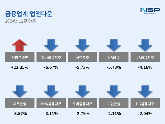 (서울=NSP통신) 강수인 기자 = 윤석열 대통령의 비상 계엄 선포 여파로 4일 코스피(-1.44%)와 코스닥(-1.98%)은 모두 하락했다. 코스피 지수는 큰 폭으로 하락하며 2500선을 뚫고 2464선까지 내려갔다. 이 가운데 은행주는 전거래일 대비 4.50% 하락했다. 은행주는 11종목 가운데 카카오뱅크를 제외한 10종목이 모두 하락했다.