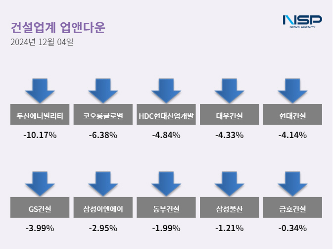 (서울=NSP통신) 정현우 기자 = 4일 코스피(-1.44%)와 코스닥(-1.98%)은 모두 하락했다. 건설주는 전 거래일 대비 2.40% 하락했고 82종목 가운데 14종목이 상승, 62종목이 하락했다. 보합세는 6종목이다.