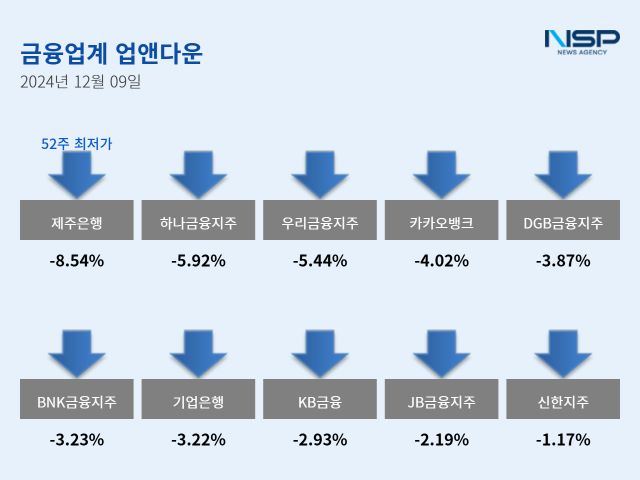 (서울=NSP통신) 강수인 기자 = 탄핵 표결이 무산되면서 9일 코스피와 코스닥이 연중 최저치까지 내려갔다. 이날 코스피는 2.78% 하락한 2360.58, 코스닥은 5.19% 하락한 627.01로 마감했다. 이 가운데 은행주는 전거래일 대비 3.35% 하락했다. 계엄령 선포 전 52주 신고가를 기록한 종목들이 속출했으나 이날엔 52주 최저가를 기록한 종목도 나왔다.