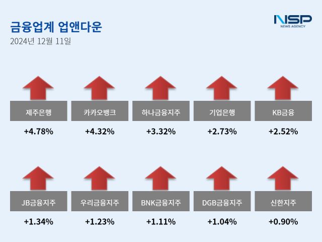 (서울=NSP통신) 강수인 기자 = 11일 코스피(+1.02%)와 코스닥(+2.17%)은 모두 상승했다. 이 가운데 은행주는 전거래일 대비 2.27% 상승했다. 은행주는 11종목 모두 상승했다.