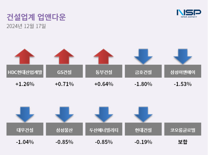 (서울=NSP통신) 정현우 기자 = 17일 코스피(-1.29%)와 코스닥(-0.58%)은 모두 하락했다. 건설주는 전 거래일 대비 0.39% 하락했고 80종목 가운데 23종목이 상승, 50종목이 하락했다. 보합세는 7종목이다.