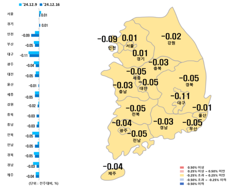 시도별로는 ▲서울(0.01%) ▲경기(0.01%)가 상승 ▲대구(-0.11%) ▲인천(-0.09%) ▲경북(-0.05%) ▲전남(-0.05%) ▲전북(-0.05%) ▲세종(-0.05%) ▲대전(-0.05%) ▲부산(-0.05%) ▲제주(-0.04%)가 하락했다.