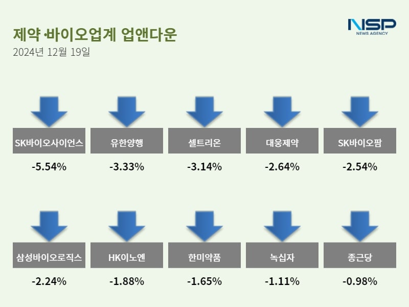 대웅제약은 전 거래일 대비 2.64%(3,400원) 하락해 12만 5500원으로 장을 마쳤고 SK바이오팜은 전 거래일 대비 2.54%(2,700원) 하락해 10만 3600원으로 장을 마감했다.