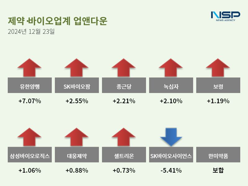 (서울=NSP통신) 이봄볕 기자 = 23일 코스피(+1.57%)와 코스닥(+1.64%)은 모두 상승했다. 제약주는 전 거래일 대비 2.02% 상승했고 183종목 가운데 131종목이 상승, 37종목이 하락했다. 보합세는 15종목이다.