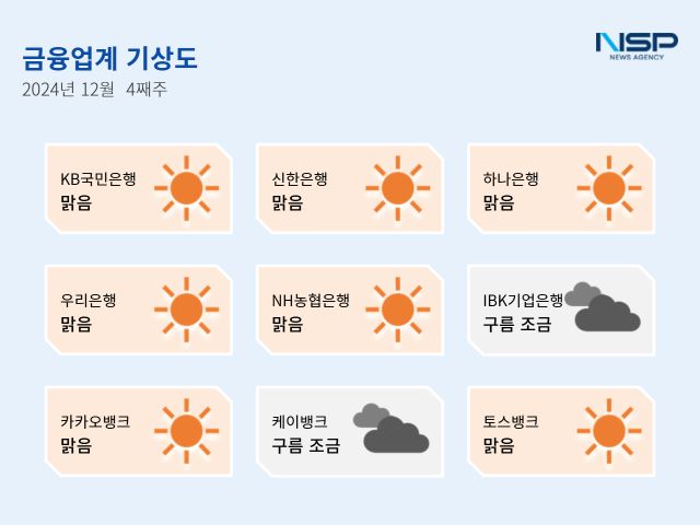 (서울=NSP통신) 강수인 기자 = 2024년 12월 4주차 금융업계기상도는 KB국민은행·신한은행·하나은행·우리은행·NH농협은행·카카오뱅크·토스뱅크의 ‘맑음’, IBK기업은행·케이뱅크의 ‘구름조금’으로 기록됐다.