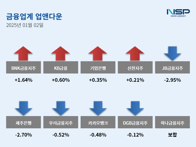 (서울=NSP통신) 강수인 기자 = 2일 코스피(-0.02%)와 코스닥(+1.24%)은 하락과 상승이 엇갈렸다. 이 가운데 은행주는 전거래일 대비 0.12% 상승했다. 은행주는 11종목 가운데 5종목이 상승, 5종목이 하락했다. 보합세는 1종목이다.