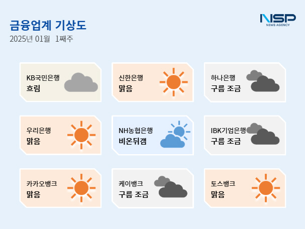 (서울=NSP통신) 강수인 기자 = 2025년 1월 1주차 금융업계기상도는 신한은행·우리은행·카카오뱅크·토스뱅크의 ‘맑음’, 하나은행·IBK기업은행·케이뱅크의 ‘구름조금’, NH농협은행의 ‘비온뒤갬’, KB국민은행의 ‘흐림’으로 기록됐다.
