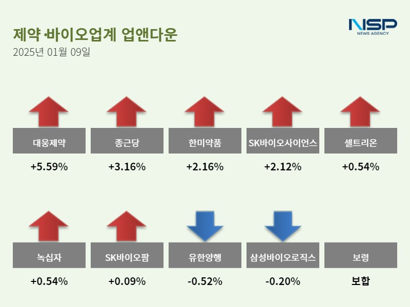 (서울=NSP통신) 이봄볕 기자 = 9일 코스피(+0.03%)와 코스닥(+0.54%)은 모두 상승했다. 제약주는 전 거래일 대비 0.48% 상승했고 184종목 가운데 90종목이 상승, 80종목이 하락했다. 보합세는 14종목이다.