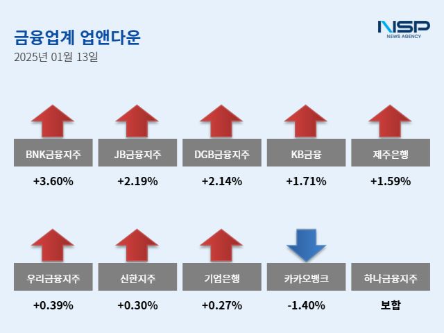 (서울=NSP통신) 강수인 기자 = 13일 코스피(-1.04%)와 코스닥(-1.35%)은 모두 하락했다. 이 가운데 은행주는 전거래일 대비 0.76% 상승했다. 은행주는 11종목 가운데 8종목이 상승, 2종목이 하락했다. 보합세는 1종목이다.