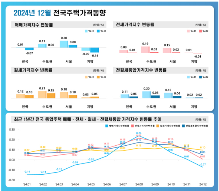 전국 집값(-0.07%)의 경우 11월 대비(0.01%) 상승에서 하락 전환됐다. 수도권(0.11%→0.00%)은 상승에서 보합 전환, 서울(0.20%→0.08%)은 상승폭 축소, 지방(-0.09%→-0.14%)은 하락폭이 확대됐다.