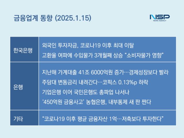 (서울=NSP통신) 강수인 기자 = 한국은행의 올해 첫 금융통화위원회가 하루 앞으로 다가온 가운데 외국인 투자자금이 대거 이탈한 것으로 나타났다. 원·달러 환율이 1462원으로 오르며 1500원대에 육박한 가운데 미국 연방준비제도(Fed) 역시 올해 말까지 기준금리를 동결할 수도 있다는 전망이 나오며 한은의 고민이 깊어진다.