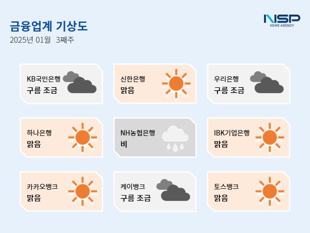 (서울=NSP통신) 강수인 기자 = 2025년 1월 3주차 금융업계기상도는 신한은행·하나은행·IBK기업은행·카카오뱅크·토스뱅크의 ‘맑음’, KB국민은행·우리은행·케이뱅크의 ‘구름조금’, NH농협은행의 ‘비’로 기록됐다.