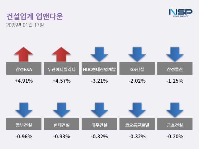 (서울=NSP통신) 정현우 기자 = 17일 코스피(-0.16%)는 하락, 코스닥(0.06%)은 상승했다. 건설주는 전 거래일 대비 0.19% 상승했고 80종목 가운데 28종목이 상승, 41종목이 하락했다. 보합세는 11종목이다.