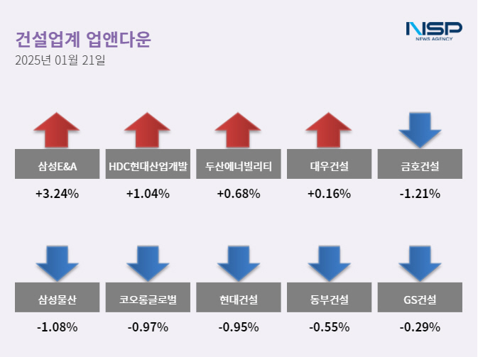 (서울=NSP통신) 정현우 기자 = 21일 코스피(-0.08%)와 코스닥(-0.22%)은 모두 하락했다. 건설주는 전 거래일 대비 0.35% 상승했고 80종목 가운데 33종목이 상승, 37종목이 하락했다. 보합세는 10종목이다.
