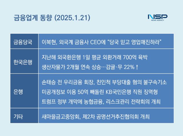 이날 트럼프 대통령의 취임과 국내에서는 윤석열 대통령의 탄핵 심판이 진행되는 가운데 이복현 금융감독원장은 외국계 금융회사 CEO들을 불러모았다. 그는 “외국인 투자자로서는 한국 금융시장에 대한 불안한 시각을 가질 수 있음을 충분히 이해하고 있다”며 “하지만 한국 경제의 기초체력을 나타내는 주요 경제지표는 여전히 양호하고 각종 국내외 불안요인이 금융회사 건전성에 미치는 영향도 제한적”이라고 강조했다. 이어 “당국을 믿고 영업에 매진해달라”고 당부했다.