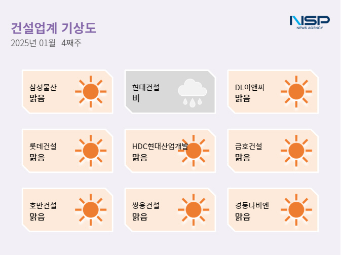 (서울=NSP통신) 정현우 기자 = 2025년 1월 4주차 건설업계기상도는 삼성물산·DL이앤씨·롯데건설·HDC현대산업개발·금호건설·호반건설·쌍용건설·경동나비엔이 ‘맑음’, 현대건설이 ‘비’로 기록됐다.