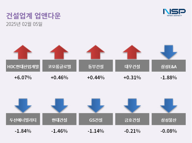 (서울=NSP통신) 정현우 기자 = 5일 코스피(1.11%)와 코스닥(1.54%)은 모두 상승했다. 건설주는 전 거래일 대비 0.44% 하락했고 80종목 가운데 35종목이 상승, 33종목이 하락했다. 보합세는 12종목이다.