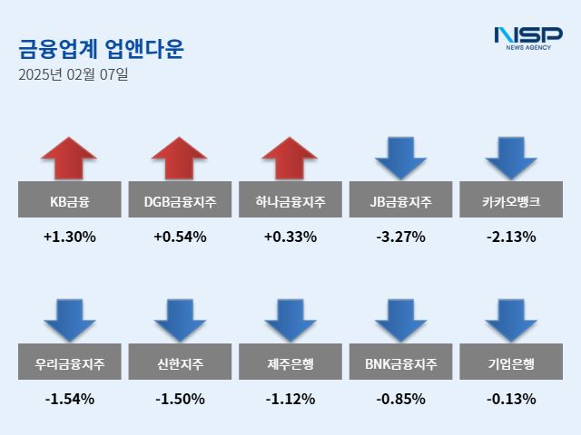 (서울=NSP통신) 강수인 기자 = 7일 코스피(-0.58%)와 코스닥(+0.35%)은 하락과 상승이 엇갈렸다. 이 가운데 은행주는 전거래일 대비 0.37% 하락했다. 은행주는 11종목 가운데 3종목이 상승, 8종목이 하락했다.