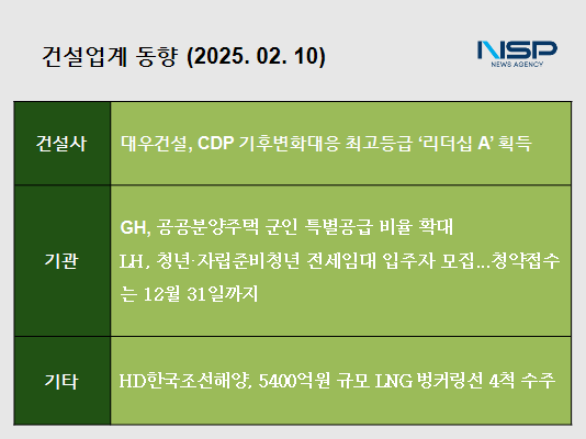 (서울=NSP통신) 정현우 기자 = 대우건설은 탄소정보공개프로젝트(CDP)에서 기후변화대응 부문 최고등급인 ‘리더십 A’를 획득해 ESG 경영 성과를 인정받았다.