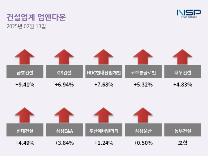 (서울=NSP통신) 정현우 기자 = 13일 코스피(1.36%)와 코스닥(0.55%)은 모두 상승했다. 건설주는 전 거래일 대비 3.33% 상승했고 80종목 가운데 53종목이 상승, 12종목이 하락했다. 보합세는 15종목이다.