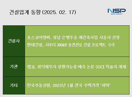 (서울=NSP통신) 정현우 기자 = 건설업계에서는 포스코이앤씨가 1조 3000억원 규모의 성남 은행주공 재건축사업 시공사로 선정돼 실적 상승에 대한 기대를 모았다. 현대건설은 사우디 전력청(SEC)이 발주한 ‘태양광 발전 연계 380㎸ 송전선로 건설 프로젝트’를 수주해 해외시장에서 경쟁력을 입증했다.