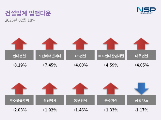 (서울=NSP통신) 정현우 기자 = 18일 코스피(0.63%)와 코스닥(0.67%)은 모두 상승했다. 건설주는 전 거래일 대비 2.41% 상승했고 80종목 가운데 45종목이 상승, 21종목이 하락했다. 보합세는 14종목이다.