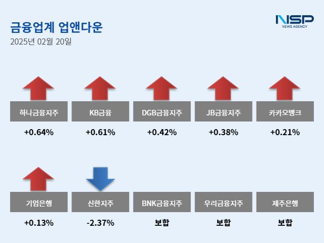 (서울=NSP통신) 강수인 기자 = 20일 코스피(-0.65%)와 코스닥(-1.28%)은 모두 하락했다. 이 가운데 은행주는 전거래일 대비 0.16% 하락했다. 은행주는 11종목 가운데 7종목이 상승, 1종목이 하락했다. 보합세는 3종목이다.