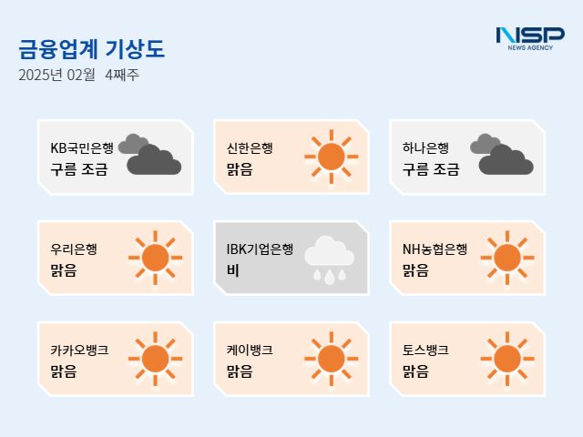 (서울=NSP통신) 강수인 기자 = 2025년 2월 4주차 금융업계기상도는 신한은행·우리은행·NH농협은행·카카오뱅크·케이뱅크·토스뱅크의 ‘맑음’, KB국민은행·하나은행의 ‘구름조금’, IBK기업은행의 ‘비’로 기록됐다.