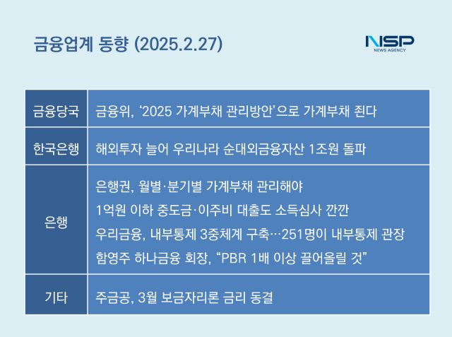 금융위원회는 ‘2025 가계부채 관리방안’을 발표했다. 이에 앞서 권대영 사무처장은 “주택담보대출 증가세를 보면 안심하기 어려운 상황”이라며 “올해 2월 들어 금융권이 영업을 재개하고 신학기 이사수요 등이 겹치며 상당한 증가세를 보여 유의할 필요가 있다”고 말했다.