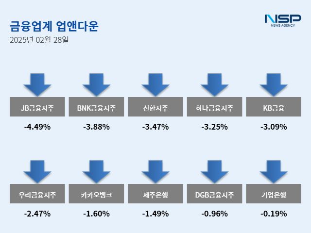 (서울=NSP통신) 강수인 기자 = 28일 코스피(-3.39%)와 코스닥(-3.49%)은 모두 하락했다. 이 가운데 은행주는 전거래일 대비 2.70% 하락했다. 비상계엄 여파로 원·달러 환율이 오르면서 금융지주의 보통주자본비율이 하락, 건전성에 대한 리스크가 커진 영향으로 풀이된다. 은행주는 11종목 모두 하락했다.
