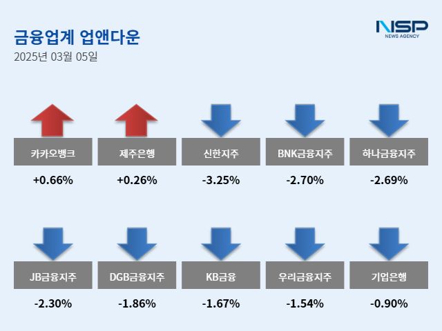 (서울=NSP통신) 강수인 기자 = 5일 코스피(+1.16%)와 코스닥(+1.23%)은 모두 상승했다. 이 가운데 은행주는 전거래일 대비 1.86% 하락했다. 은행주는 11종목 가운데 3종목이 상승, 8종목이 하락했다.
