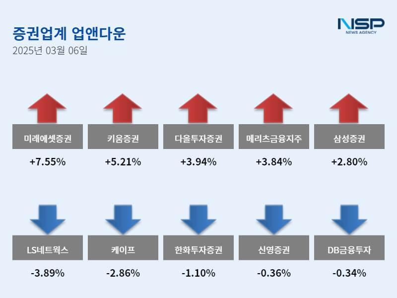 (서울=NSP통신) 설희 기자 = 6일 코스피(+0.70%), 코스닥(-1.61%)은 상승과 하락이 엇갈렸다. 이 가운데 증권주는 전거래일 대비 3.26% 상승했다. 증권주는 38종목 가운데 상승 26개였고 보합 1개, 하락 11개였다.