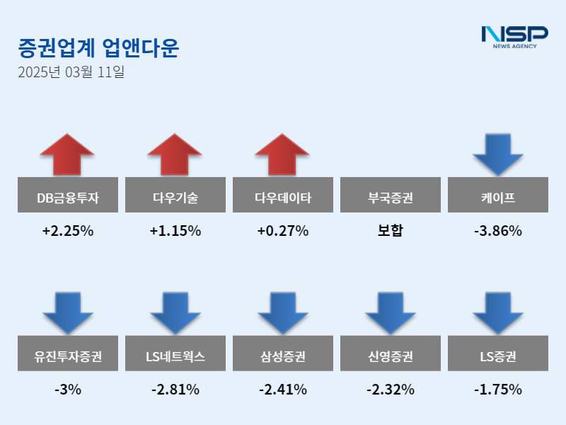 (서울=NSP통신) 설희 기자 = 11일 코스피(-1.28%), 코스닥(-0.60%)은 모두 하락했다. 이 가운데 증권주는 전거래일 대비 1.27% 하락했다. 증권주는 38종목 가운데 상승 4개였고 보합 3개, 하락 31개였다.